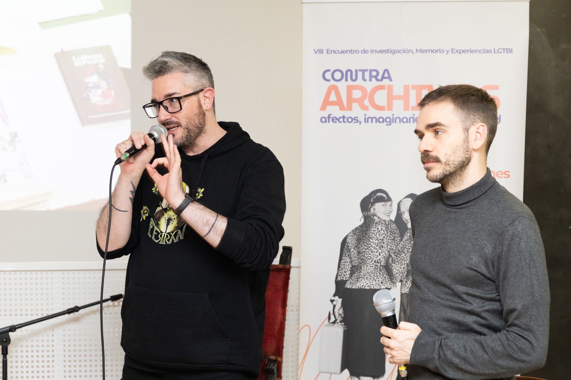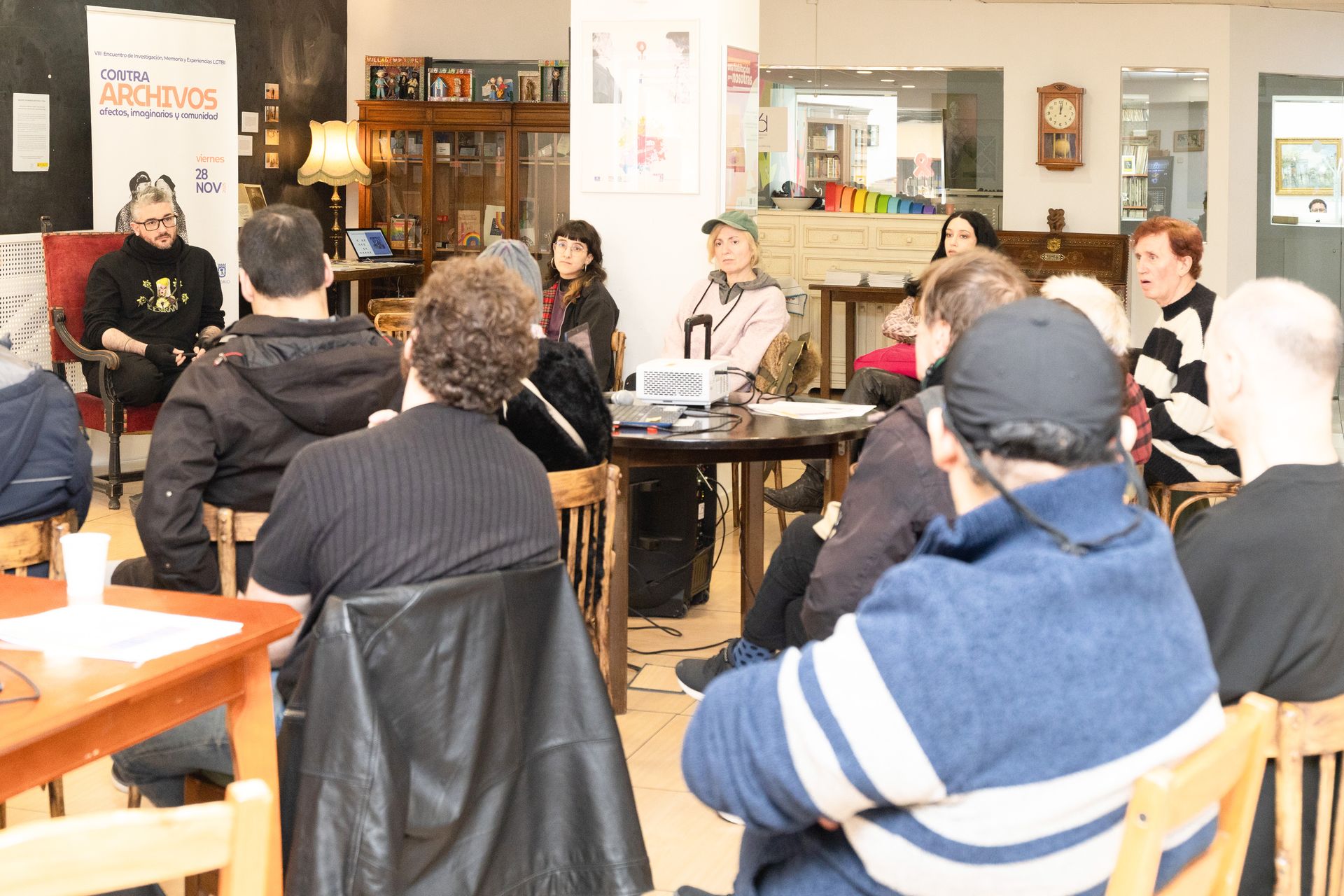 Para hablar del Archivo Arkhé, se contó con la participación de uno de sus fundadores, Pedro Felipe Hinestrosa, que reflexionó sobre el trabajo que realizan. Su exposición se inspiró en la reflexión del “Altar de la Esperanza” (Ara Espei) sobre Karl Ulrichs, activista alemán LGTBIQ+. “El archivo Arkhé en su origen y en su misión puede leerse como una prolongación material de ese gesto, allí donde Ulrichs levantó un altar de palabras; Arkhé procura levantar un altar de papeles y libros. Si Ulrichs nos entregó un símbolo, Arkhé lo encarna en un espacio tangible, un repertorio donde los testimonios del deseo Queer, tantas veces perseguidos y borrados, se conservan y se leen”, estas palabras resumen las ideas principales que Hinestrosa recalcó durante su intervención.