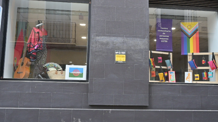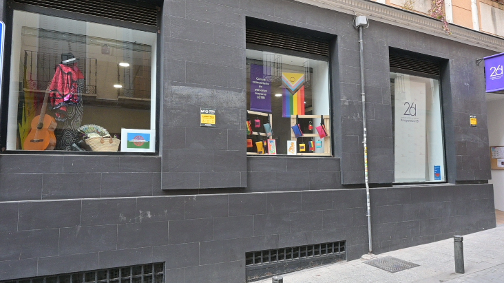 Exterior de la Fundación 26 de Diciembre, con escaparate dedicado al Pueblo Gitano
