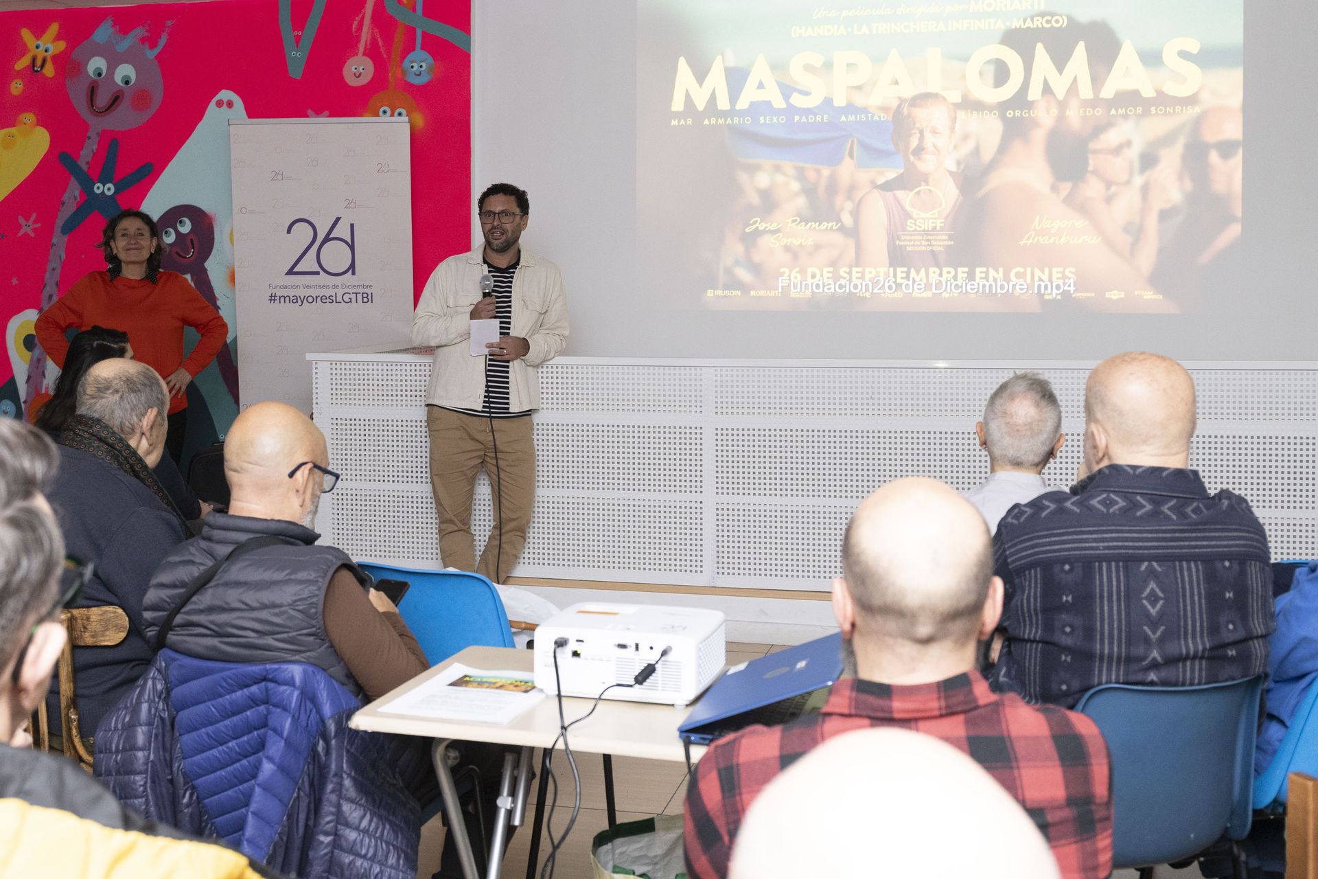 Madrid, 3 de diciembre. El miércoles 3 de diciembre alrededor de 50 personas asistieron a la proyección de 'Maspalomas' en la Fundación 26 de Diciembre. Durante el coloquio tras el visionado se analizó cómo la cinta aborda los miedos, deseos y proyecciones del colectivo al afrontar el envejecimiento y la vida en residencias.