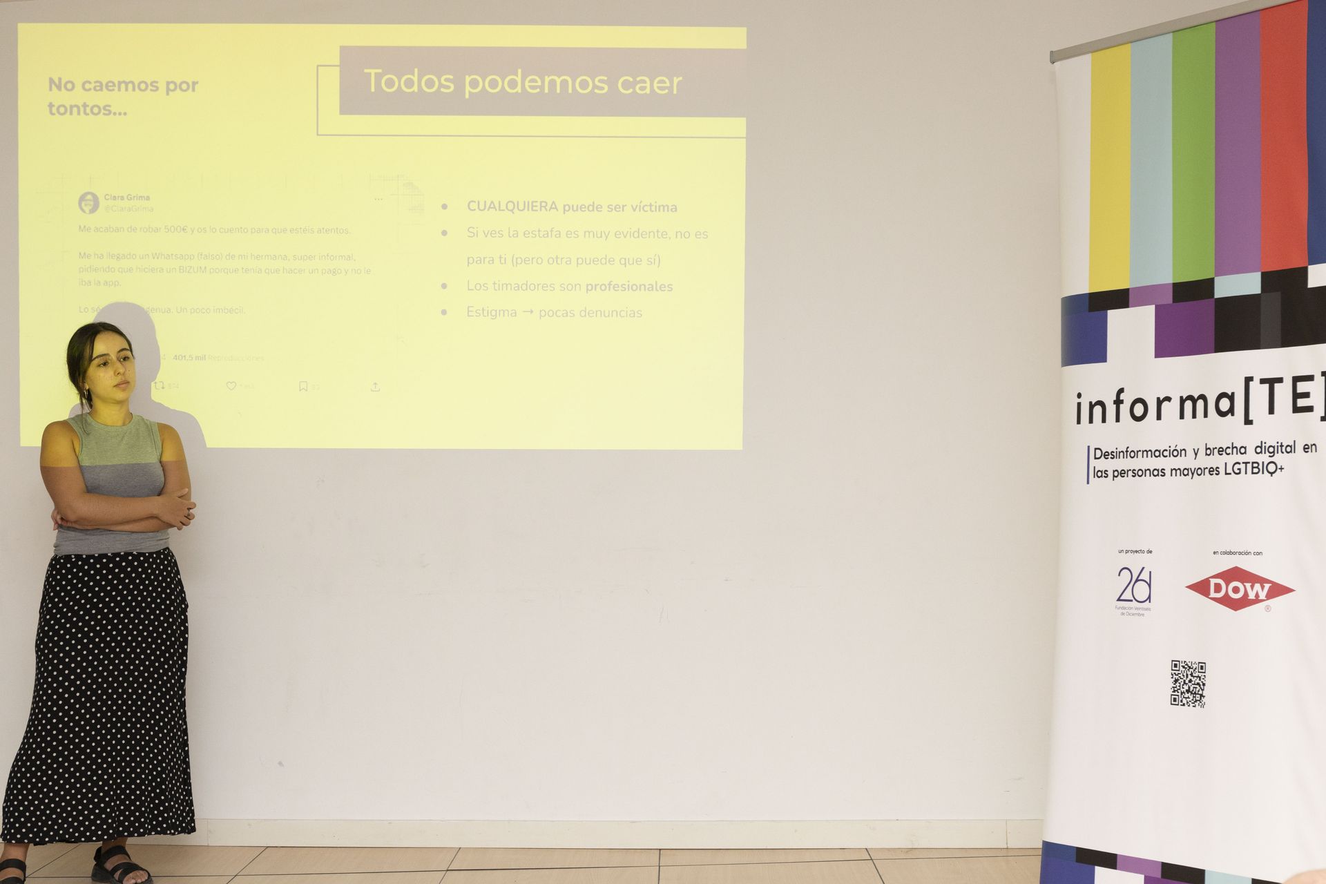 Como principio básico se sostuvo que todas las personas somos susceptibles de caer en una estafa. Se compartió una anécdota personal sobre recibir una multa fraudulenta de la DGT (Dirección General de Tráfico) por SMS, a la cual la participante de la formación no accedió porque comprobó su veracidad con una amiga. Esta fue considerada como la acción correcta ya que el objetivo de estos mensajes masivos es que la víctima entre en un enlace para robar sus datos personales y bancarios.